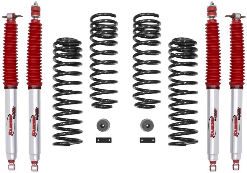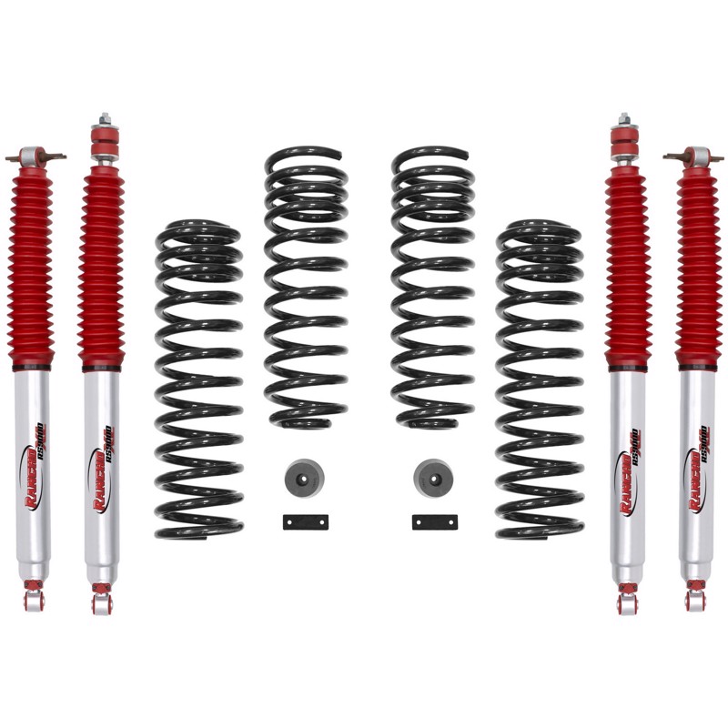 Rancho® is proud to offer a new 2-in. Suspension System for the Jeep Wrangler JK. The 2-in. Rancho Suspension Progressive Sport Kit features our premium 9-way adjustable RS9000™XL shocks, front & rear variable rate coil springs to provide superior on-road comfort and off-road performance, rear brake line brackets, and front bump stops. This kit is precision engineered to be 100-percent compatible with the Jeep factory Electronic Stability System. The kit was designed with 33-in. tires and 17-in. wheels with 4.5-in. of backspacing, but also can accommodate 35-in. tire with minor trimming. Kit also allows the reuse of O.E. Wheels and tires. The Rancho brand offers a Limited Lifetime Warranty** for this suspension system. Rancho Suspension Kit for Jeep Lift kits