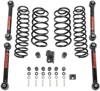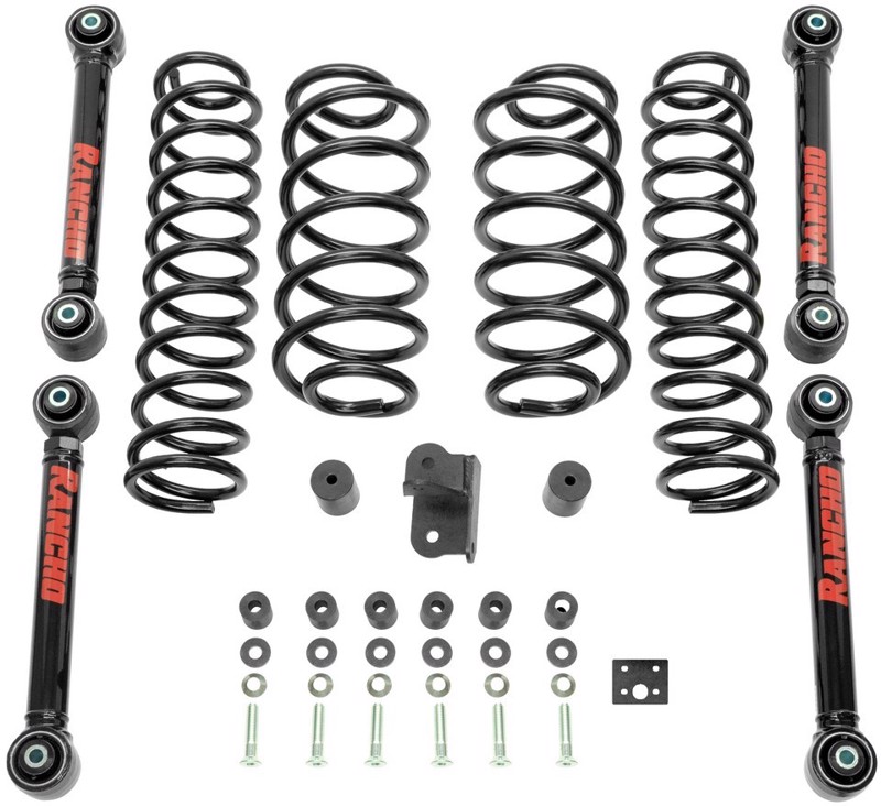 Experience the Rancho® difference and uncompromising performance on- and off-road with the updated and redesigned Rancho® 2.5-inch Coil Spring Sport Suspension Kit. This kit allows you to run up to 33-inch tires on your Wrangler TJ/LJ, and comes complete with coil springs, transfer case drop down spacers, rear bump stop spacers, transfer case shifter relocation bracket, rear axle track bar relocation bracket, and NEW adjustable lower control arms. The NEW control arms allow for the adjustment of caster and pinion angle and have forged ends featuring Rancho’s D2 grease-free synthetic high articulation bushings that self-center. Complete your performance suspension by choosing the Rancho nshocks that best suit your driving needs! The Rancho brand offers a Limited Lifetime Warranty** for this Suspension System. Rancho Suspension Kit for Jeep Lift kits