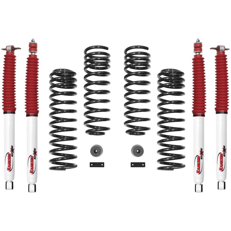 Rancho® is proud to offer a new 2-in. Suspension System for the Jeep Wrangler JK Unlimited . The 2-in. Rancho Suspension Progressive Sport Kit features our NEW RS5000™X shocks, front and rear variable rate coil springs to provide superior on-road comfort and off-road performance, rear brake line brackets, and front bump stops. This kit is precision engineered to be 100-percent compatible with the Jeep factory Electronic Stability System. The kit was designed with 33-in. tires and 17-in. wheels with 4.5-in. of backspacing, but also can accomidate 35-in. tire with minor ntrimming. Kit also allows the reuse of O.E. Wheels and tires. The Rancho brand offers a Limited Lifetime Warranty for this suspension system. Rancho Suspension Kit for Jeep Lift kits